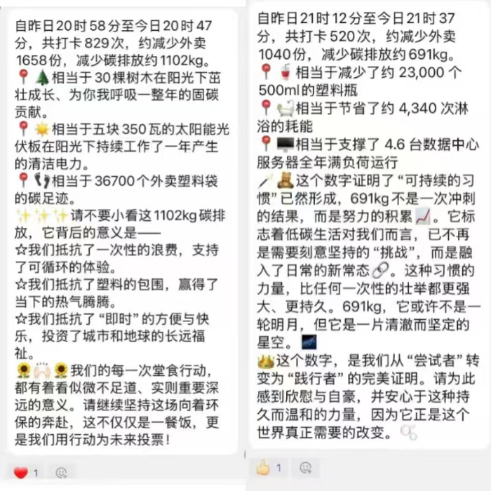 一、創新活動形式,理念倡導與行為引導并重面對高校普遍存在的外賣依賴與餐飲浪費問題,本次活動旨在通過持續的集體實踐,探索行為改變的可行路徑。活動設計了兼具趣味性與挑戰性的打卡機制,將抽象的環保理念轉化為“每日堂食+光盤”的具體行動,讓參與者在親身實踐中感知綠色生活方式的實質內涵。