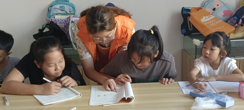 (圖為推普團成員正在進行作業(yè)輔導(dǎo)。)