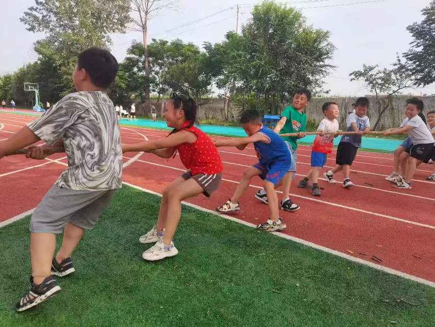首先,開展的項目是短跑比賽,在“預備:跑!”一聲令下,孩子們像離弦的箭沖向終點,你追我趕,勇爭第一;在休息間隙,六年級的孩子開始了足球比賽,隨著主裁判的一聲哨響,兩隊開始了激烈地拼搶,在兩隊的共同努力下,兩隊不相上下,都取得了較為優異的成績;接著,開展的項目是接力折返跑,孩子們自由組隊,根據自己的跑步速度自行分配不同節點的人選,接力跑往往需要考量小隊伍的團結和配合能力,四個隊伍的接力跑速度相差不大,每個小團隊都在為共同的勝利而團結互助、一起努力;隨后,開展的是“一二三木頭人”和“趣味跳繩”活動,一二三年級與四五六年級分別開展。“一二三,不許動!”聽著一聲聲口令,孩子們時而向前沖,時而立在原地,歡聲笑語常常縈繞在耳畔。哨聲一響,緊張的跳繩比賽拉開了帷幕,每位參賽的學生都使出渾身解數,超越自我,跳出了自己的好成績。最后,開展的是“拔河”比賽,支教隊成員將學生根據身高體重劃分為兩個小組,在一聲聲口號中,每個孩子都緊緊地拉住繩子,身子往后倒,腳站成弓步,聽到“比賽結束”的口令,孩子們松開繩子,坐在地上,交談著比賽的所感。