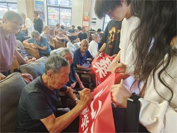 圖為實踐團隊邀請老人參加橫幅簽字活動,在橫幅上簽名。