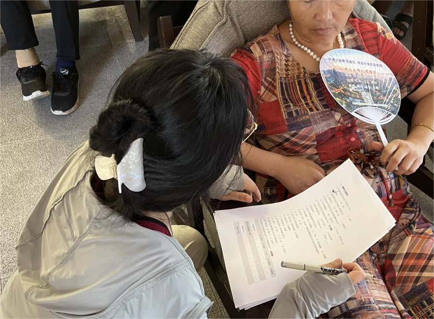圖為實踐團隊在訪問老人并進行調查問卷的填寫。