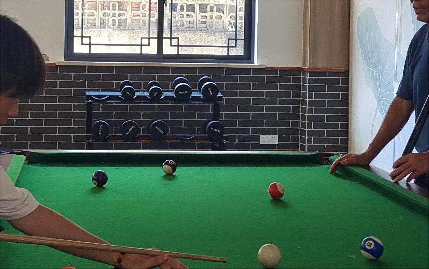 圖為實踐團隊成員在健身房與老年人切磋球藝。