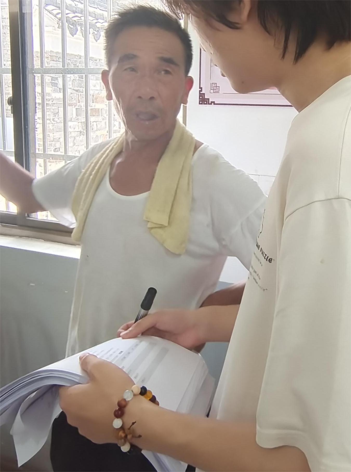 圖為實(shí)踐隊(duì)員就共同富裕問(wèn)題向老人進(jìn)行調(diào)研。