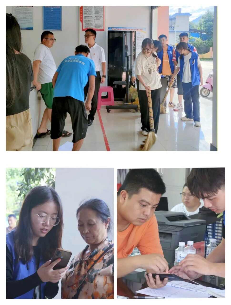 圖為同學們正在打掃衛生以及體驗基層工作,幫助村民剛注冊個體工商戶。