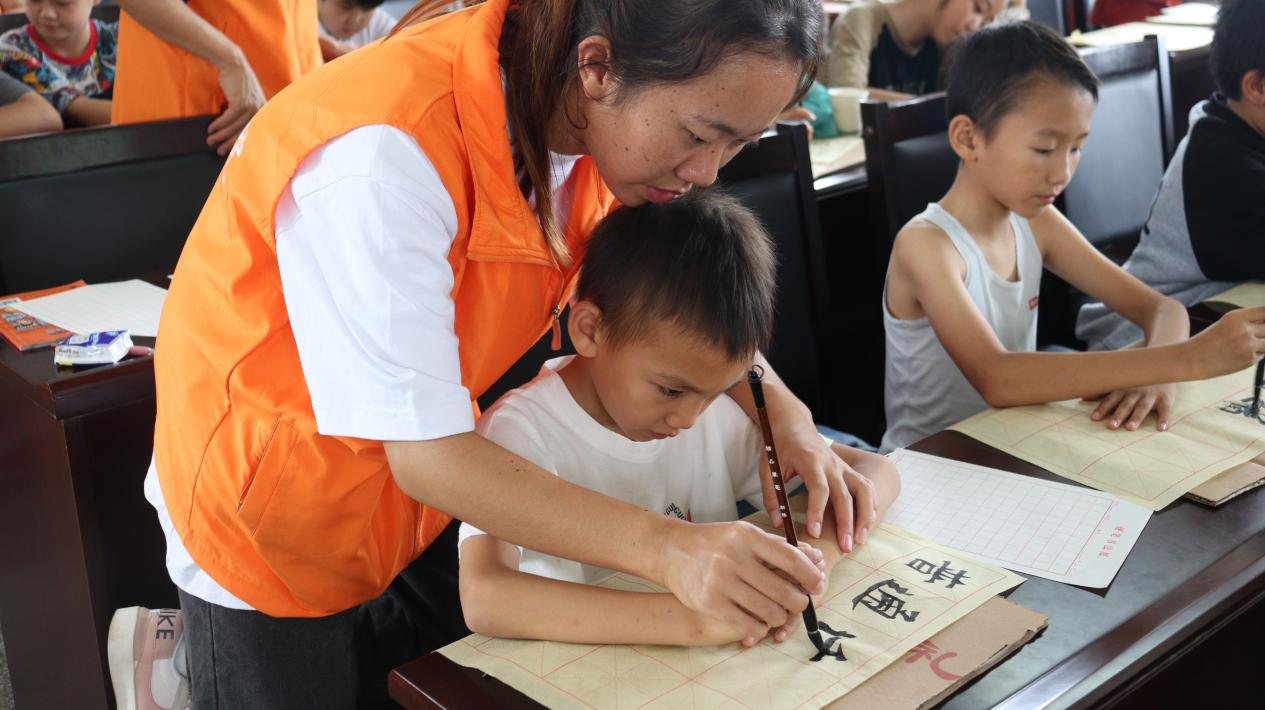 (圖為志愿者指導小朋友寫毛筆字)