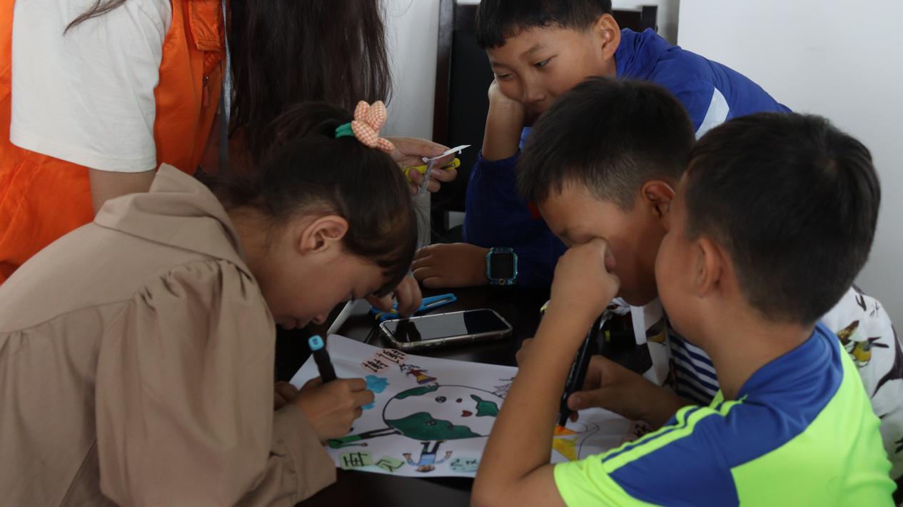 (圖為志愿者攜小朋友們共繪海報中)