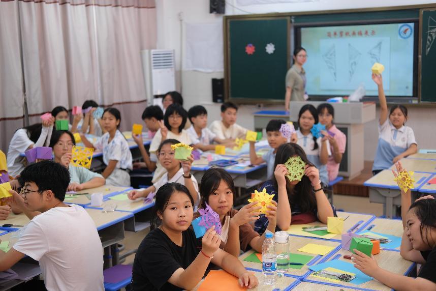 美育滲透在全面發(fā)展教育的各個方面,起著輔德、益智、促體的作用。為弘揚中華優(yōu)秀剪紙文化,服務(wù)隊設(shè)置了手工剪紙課程,讓學(xué)生們在認識美、理解美、欣賞美的過程中感受中華非遺文化的源遠流長。課堂上孩子們笑聲不斷,以一剪一紙感受紙間“靈動”,發(fā)揮自己的想象力創(chuàng)造獨一無二的美,由此接續(xù)中華優(yōu)秀非遺文化之星火。在最后的展示環(huán)節(jié),孩子們各自舉起所制作的剪紙,興奮地歡呼著。一顆藝術(shù)之種由此播種,一場藝術(shù)之夢由此放飛。