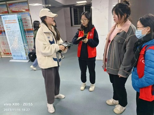 2023年11月16日下午六點二十,活動負責人易碧藍與沙湖環保志愿隊志愿者提前到資源環境學院一層確認物資并集合進行簽到,確認人員后進行志愿者服裝·廢品手機袋·活動禮品等活動物品的發放。(如圖1)
