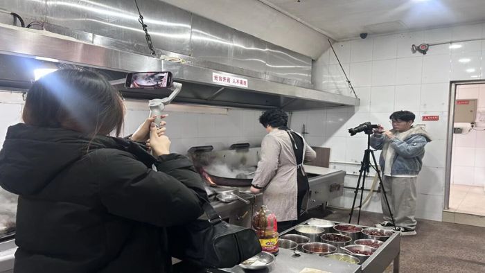 圖注:隊員在新發飯店拍攝黃河古道鮮魚湯炒料環節特寫