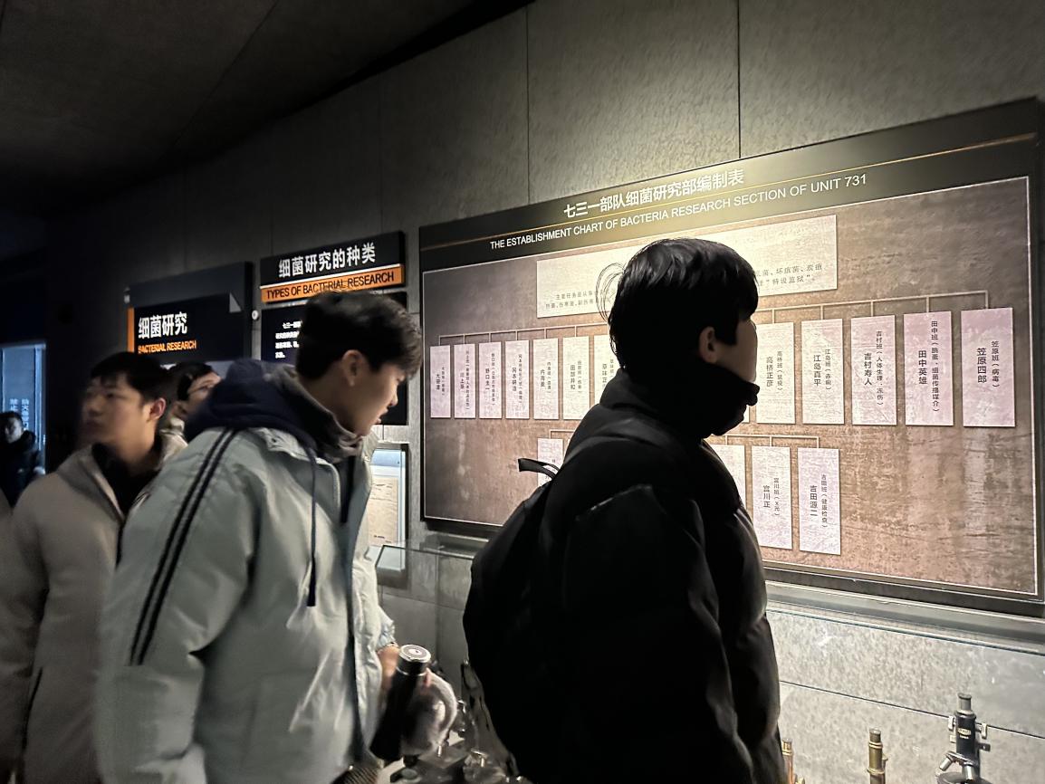 外形似“黑盒”的罪證陳列館,整體色調凝重,側傾半下沉的設計如同大地被割開的“殤痕”,寓意著這里封存著不可磨滅的歷史秘密。走進陳列館,序廳中用中、英、俄、日等六國語言鐫刻的“反人類暴行”字樣直擊人心,30余件日本天皇敕令、參謀本部指示等檔案,清晰證明了731部隊的罪行是日本自上而下有組織、有預謀的國家犯罪。學子們駐足凝視著銹跡斑斑的細菌炸彈復制品、凍傷實驗相關展品,認真聆聽講解人員講述“特別移送”制度的罪惡、活體解剖的慘狀,以及1549名被實驗者的悲慘遭遇,每一件展品、每一段史料、每一個故事,都讓大家深切感受到日本軍國主義的殘暴無情,心靈受到了前所未有的震撼與洗禮。