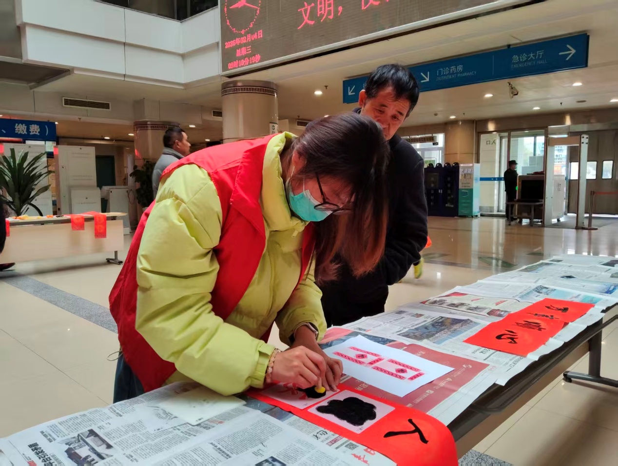 活動現場暖意融融,志愿服務的紅色身影成為醫院里一道亮麗的風景線。在醫院門診大廳,我校志愿者們化身 “新春福使”,參與寫春聯、剪福字活動。大家伏案揮毫、巧手翻飛,將滿滿的新春祝福融入筆墨與剪刀之間,一幅幅寓意吉祥的春聯、一個個精致喜慶的福字,經由志愿者之手送到就診患者及家屬手中,為忙碌的就醫環境增添了濃厚的年味。