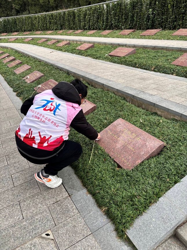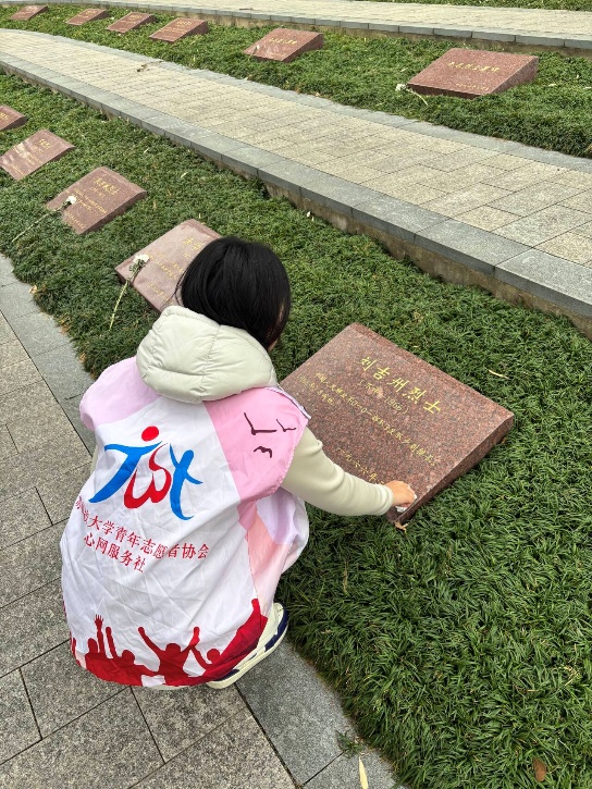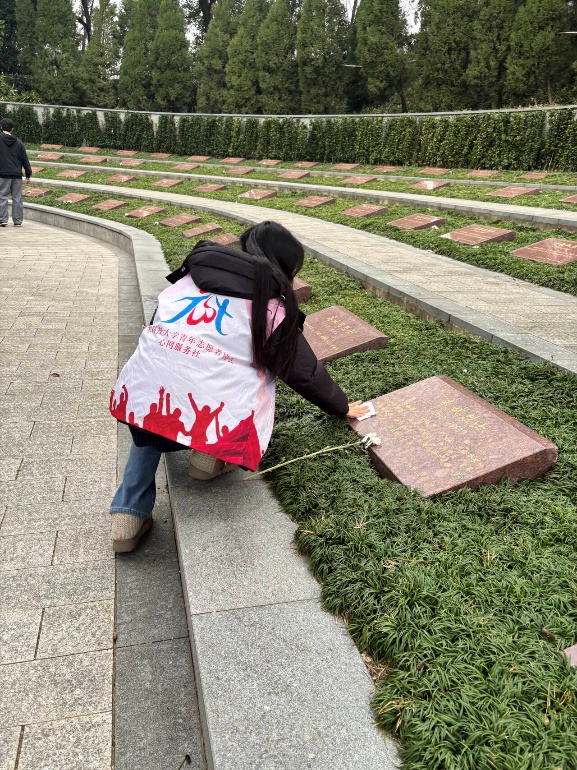 學習瞻仰結束后,實踐隊成員結合實際情況,在陵園園區內開展了志愿服務與清潔維護工作。一部分同學手持清潔工具,認真清掃陵園主干道、紀念碑周邊及綠化帶內的落葉與雜物,擦拭烈士墓碑,用實際行動表達對先烈的敬仰之情,維護莊嚴肅穆的瞻仰環境。另一部分同學則在陵園入口及主要路口擔任文明引導員,耐心提醒前來瞻仰的市民保持肅靜、文明祭掃,并協助工作人員解答簡單的參觀咨詢。同學們態度認真,舉止莊重,展現了當代大學生良好的精神風貌和社會責任感。