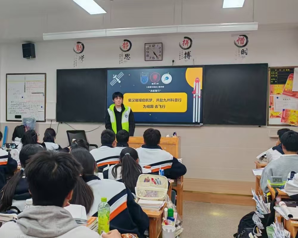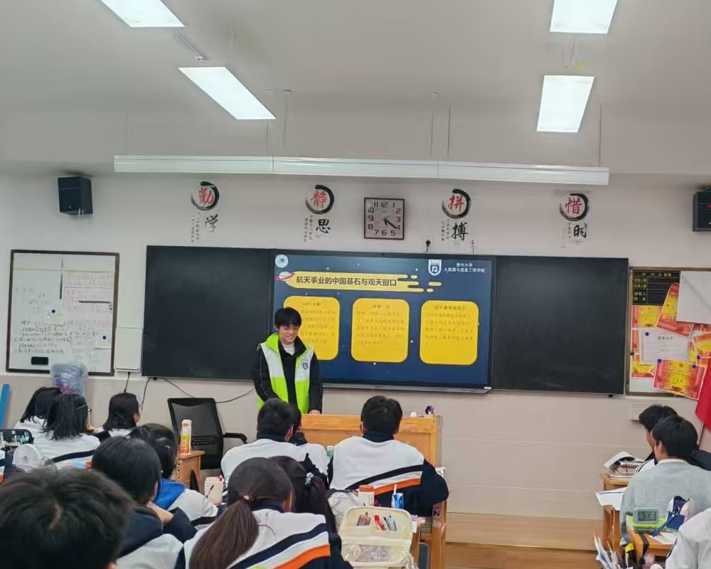 2026年1月18日,正值寒冬時節,貴州師范大學附屬中學的教室里卻座無虛席、氣氛熱烈,一場以“逐夢航天,強國有我”為主題的航天愛國實踐宣講活動在這里順利開展。本次活動由貴州大學大數據與信息工程學院的青年志愿者團隊走進附中校園,通過專題分享、視頻展播、互動問答等多種形式,為附中學子帶來了一場兼具科學性與思想性的航天愛國教育盛宴,讓航天精神與家國情懷在青少年心中生根發芽。