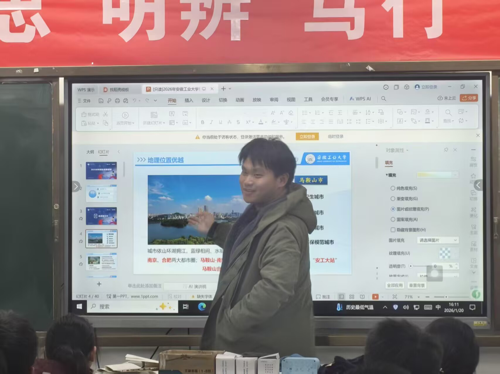 安徽工業大學“我把工大帶回家”實踐隊員朱錦輝同學進入滁州鳳陽英華中學向高三年級同學開展宣講。在滁州鳳陽英華中學的宣講會上,實踐成員朱錦輝同學以“我的大學,我的成長”為主題結合PPT,介紹了馬鞍山的地域特色景點和美食,分享了在安徽工業大學的學習生活體驗和心路歷程,詳細講解學校專業與人才培養。
