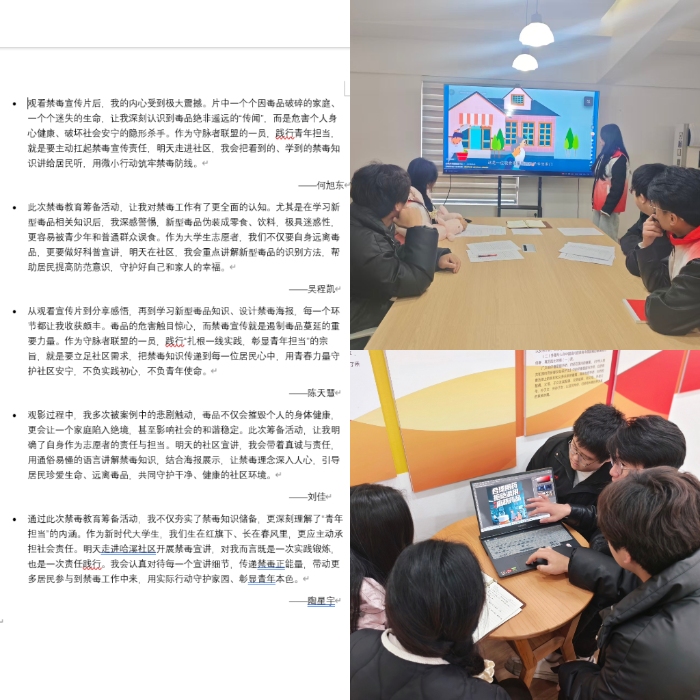 禁毒宣傳是守護社區平安的重要舉措。為做好后續宣講工作,實踐隊首先開展專項禁毒教育籌備活動。隊員們集中觀看禁毒宣傳片,通過真實案例直觀感受毒品對個人、家庭和社會的嚴重危害,深刻認識到禁毒工作的緊迫性與重要性。觀影結束后,隊員們踴躍發表感言,分享內心觸動,紛紛表示要以實際行動傳遞禁毒理念。隨后,大家圍繞新型毒品展開系統學習,細致了解其種類、偽裝形式及識別方法,重點梳理易被青少年忽視的禁毒誤區,結合社區居民特點整理宣講重點。學習結束后,隊員們分工協作,精心設計禁毒宣傳海報,以鮮明的色彩、簡潔有力的標語將禁毒知識融入設計之中,為后續宣講筑牢基礎。