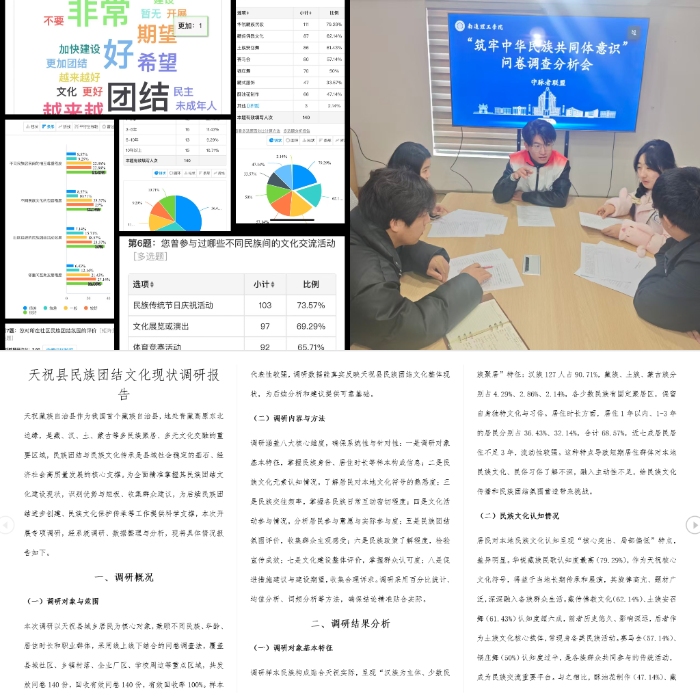 民族團結是社區發展的根基。實踐隊以“鑄牢中華民族共同體意識”為核心,在社區開展主題宣講,講述天?h多民族共生共榮的歷史與鄰里互助的暖心故事,讓“中華民族一家親”理念深入人心。在此基礎上,實踐隊重點推進線上民族團結文化調研。隊員們精心設計科學問卷,圍繞民族認知、文化交往、政策了解等維度設置問題,通過多種線上渠道廣泛發放,全面收集當地群眾對民族團結文化的認知與感受。問卷回收后,團隊第一時間召開分析會議,隊長何旭東主持會議并發言,他結合調研數據指出:“從反饋來看,各族群眾對民族團結的認同感很高,但在文化交往深度上仍有提升空間。”隊員們分工協作,深入挖掘數據背后的亮點與不足,最終立足天祝實際撰寫完成民族團結文化調研報告,為當地相關工作提供參考,助力各民族交往交流交融。