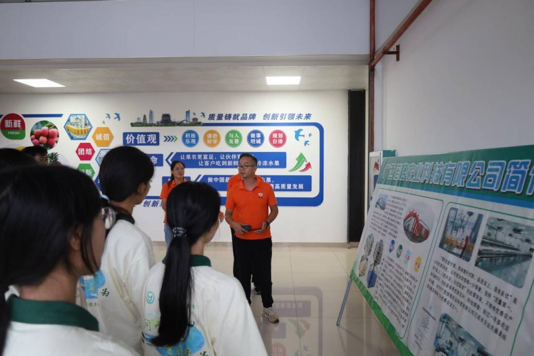 帶著對農產品加工的好奇,實踐團走進廣西倍格農業科技有限公司開展實地參觀。作為園區代表性農產品加工企業,該公司以芒果、百香果等本地特色水果為主要原料,開展鮮果分揀、深加工及產品研發,加工產品供應茶飲行業,已構建起基礎產業鏈條。