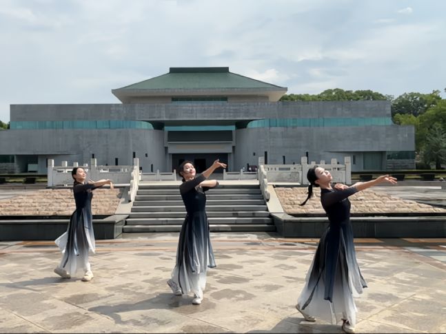 圖為舞蹈表演組在革命歷史紀念館外表演的舞蹈《黨旗飄揚的方向》。郝黎穎攝