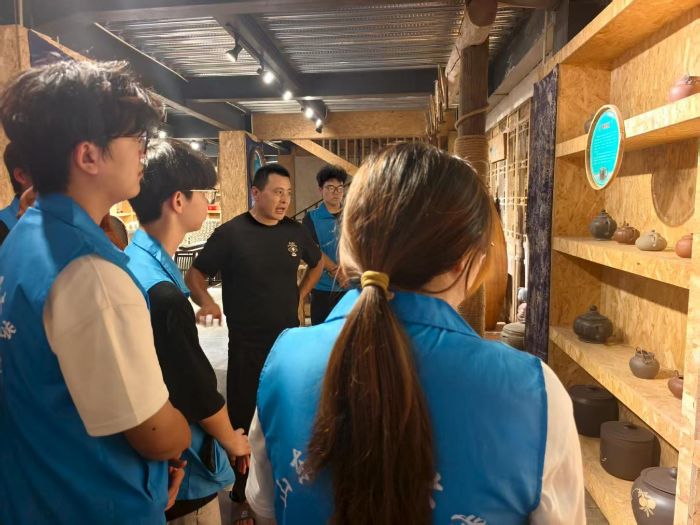 關于紫砂礦的展區則充滿科普性。展柜內,不同種類的紫砂礦原料與燒制后的成品并列擺放,紫泥的溫潤、紅泥的明艷、綠泥的清雅,色澤各異卻都透著自然質感。尹經理介紹,2000年左右是紫砂礦開發的高峰期,后因紫砂礦屬不可再生資源,國家開始嚴控開采,許多礦庫已封閉保護。同時,展區也揭示了真假紫砂的辨別方法:真品燒制后顏色源于原料本身,表面溫潤內斂;假紫砂多為陶瓷模仿并人工上色,看起來光亮刺眼。“現在網上直播頻繁售賣的低價紫砂壺,很多都是仿制品,大家購買時一定要注意辨別。”這番講解讓成員們對紫砂文化有了更理性的認識。