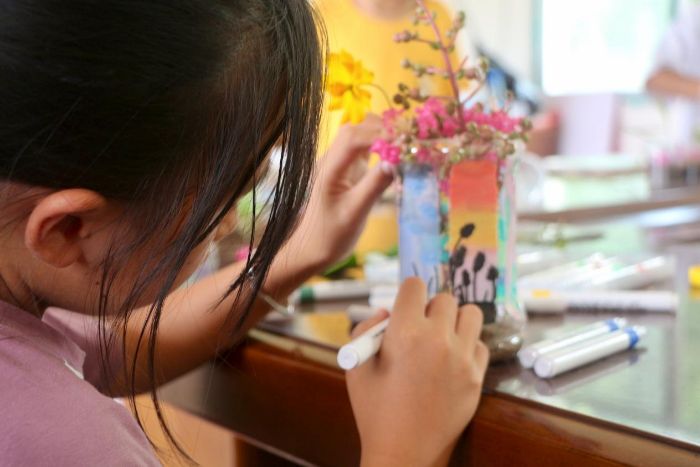 圖為小朋友繪制“生態(tài)瓶”花盆 郭佳晨攝。