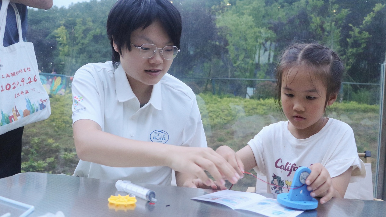 實踐團成員劉朝霞幫助小朋友解決實驗難題 理論講解之后,孩子們迎來了期待已久的實驗環節。“紅色線是電子小工人從發電站出發的傳送帶,黑色線是它們干完活回家的隧道!”實踐團成員劉朝霞握著小朋友的手,將銅線精準插進端子口。一位小朋友成功組裝好實驗器材,水流沖擊葉片的剎那,他蹦跳著舉起發光的燈泡:“我的水電站發電啦!”
