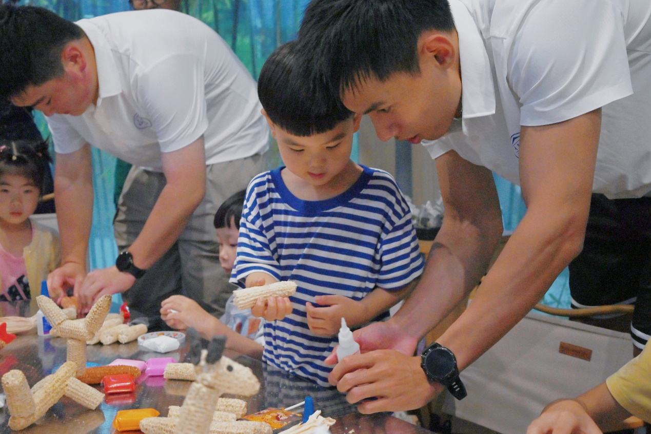 制作完成后,孩子們紛紛舉起作品分享:“我的叫‘玉米超人’,它有彩色橡皮泥做的披風!”“這是‘卷卷蛇’,用玉米皮做了花紋!”稚嫩的聲音里滿是驕傲,現場不時響起鼓勵的掌聲。