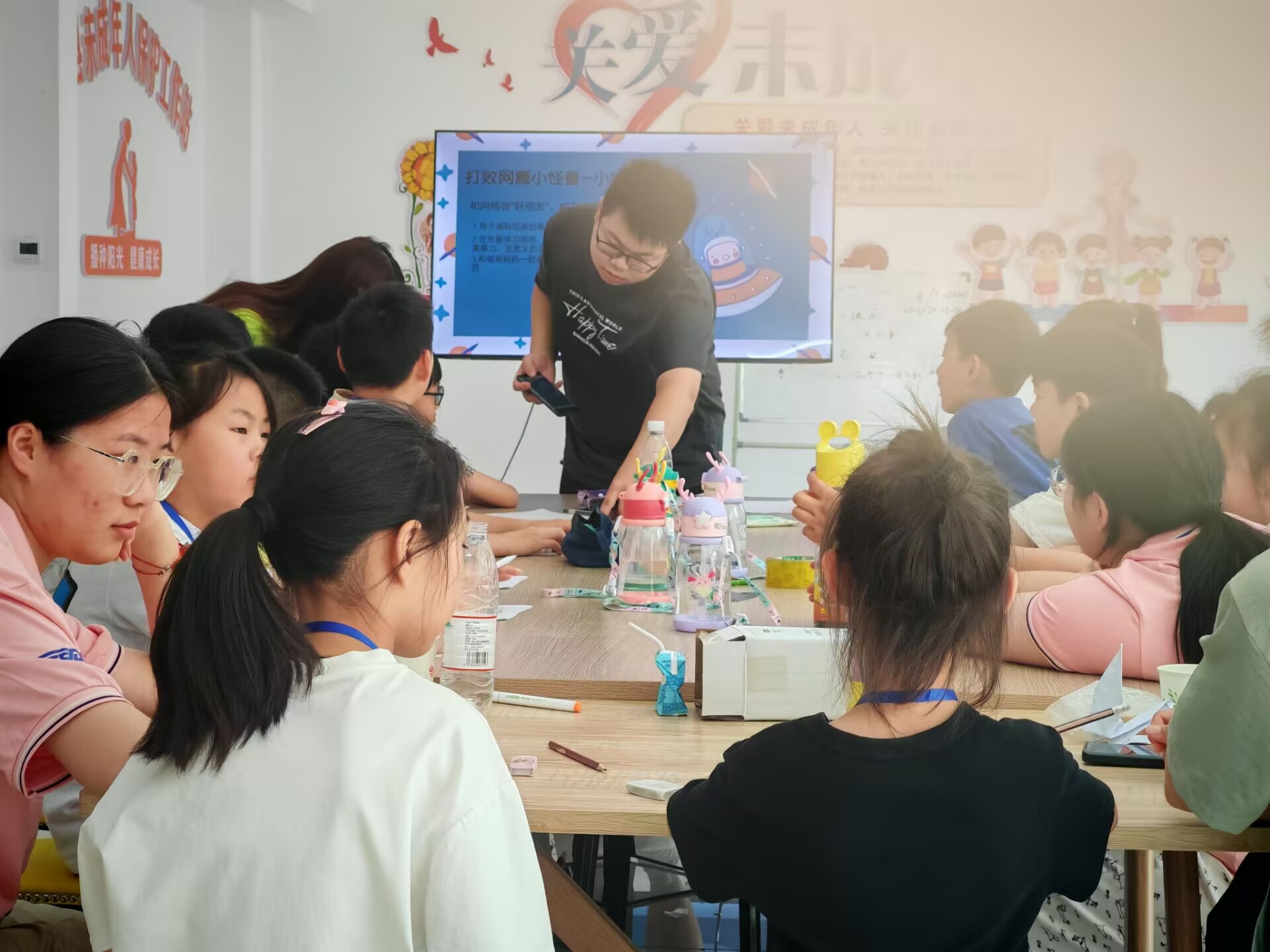在暑托班的宣傳實(shí)踐中,團(tuán)隊(duì)有不少特色亮點(diǎn)。例如,在活動(dòng)期間穿插小測(cè)試。通過(guò)一些簡(jiǎn)單的自我判斷題讓小朋友們意識(shí)到網(wǎng)癮并不遙遠(yuǎn)。在活動(dòng)結(jié)尾,宣傳團(tuán)隊(duì)還進(jìn)行了第二次測(cè)試,來(lái)起到反思激勵(lì)的作用。活動(dòng)中小朋友們熱情高漲,都積極參與其中。這不僅加深了他們對(duì)網(wǎng)癮知識(shí)的理解,也增加了活動(dòng)的趣味性。圖片2為小朋友們認(rèn)真做測(cè)試題,薛夢(mèng)寒?dāng)z。