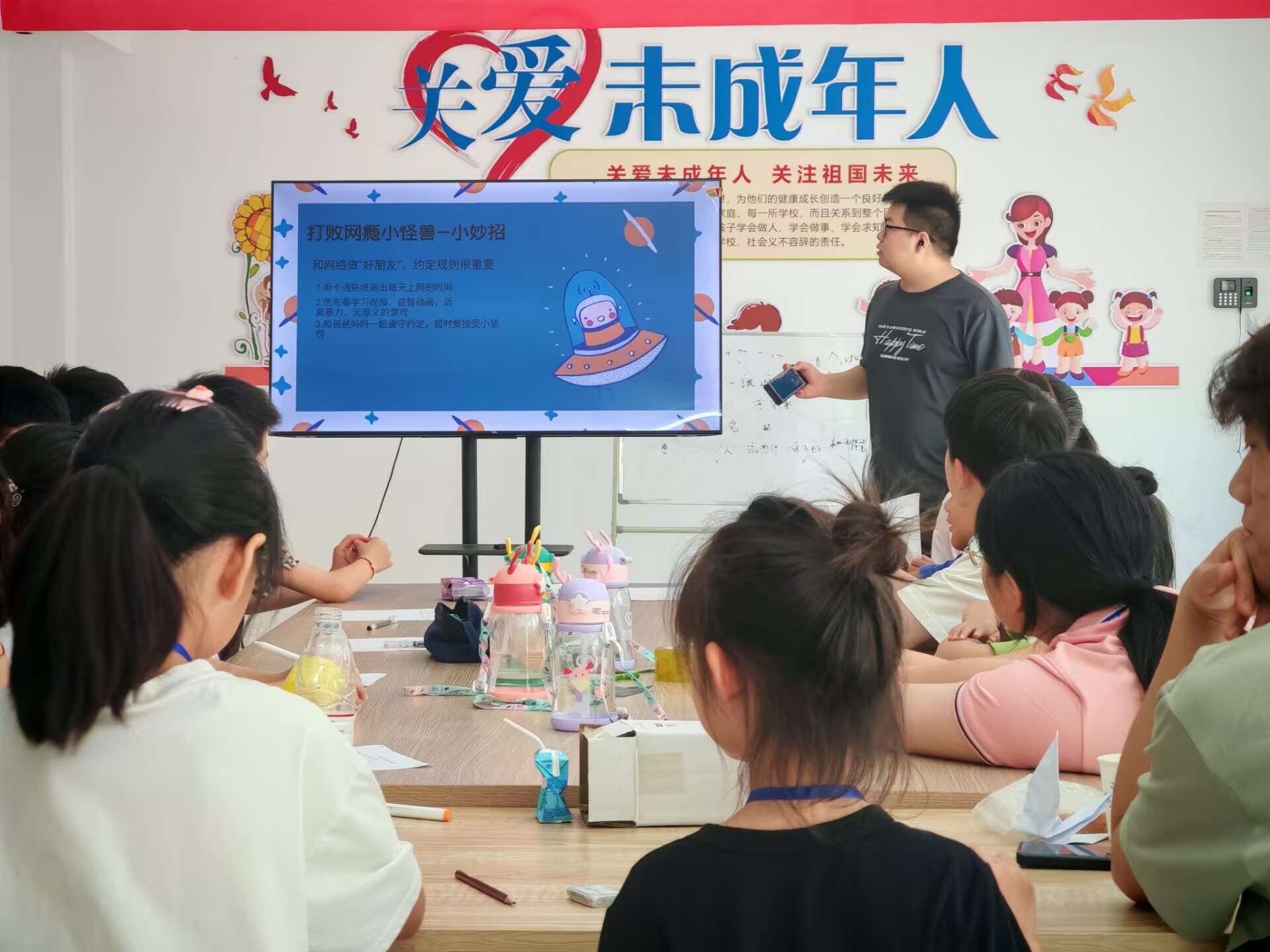在當(dāng)今數(shù)字化時(shí)代,網(wǎng)絡(luò)是一把“雙刃劍”。一方面,它為人們提供了海量的信息、便捷的交流和豐富的娛樂(lè);另一方面,過(guò)度使用網(wǎng)絡(luò)帶來(lái)諸多危害。成人如此,兒童亦然。對(duì)于小朋友們來(lái)說(shuō),過(guò)度上網(wǎng)極有可能導(dǎo)致用眼過(guò)度、身體素質(zhì)下降等不良后果。那么怎么知道一個(gè)小朋友有沒(méi)有染上網(wǎng)癮呢?可以通過(guò)網(wǎng)癮的一些表現(xiàn)來(lái)加以判斷,如難以控制上網(wǎng)時(shí)間、對(duì)其他活動(dòng)缺乏興趣等。為了“從娃娃抓起”,盡早開(kāi)始干預(yù)網(wǎng)癮,最大化降低網(wǎng)絡(luò)成癮對(duì)祖國(guó)未來(lái)?xiàng)澚旱膫ΓWo(hù)青少年身心健康,實(shí)踐團(tuán)隊(duì)聯(lián)系了當(dāng)?shù)氐奈闯赡耆吮Wo(hù)站,線下與小朋友們面對(duì)面宣傳濫用網(wǎng)絡(luò)的危害,通過(guò)交流互動(dòng),教育孩子們?nèi)绾伪苊饩W(wǎng)癮帶來(lái)的傷害。圖片1為實(shí)踐隊(duì)員在講述有關(guān)網(wǎng)絡(luò)的積極作用和消極影響,薛夢(mèng)寒?dāng)z。