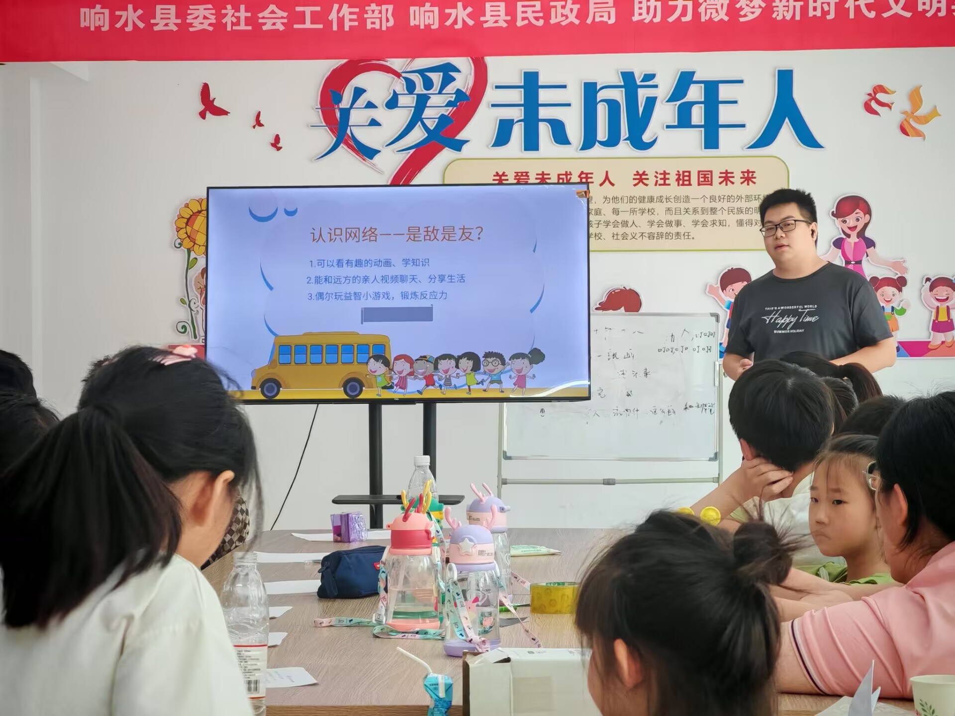 2025年7月25日,在江蘇省鹽城市響水縣北海路海悅東鳴府門(mén)口的未成年人保護(hù)站,為了提高兒童對(duì)于網(wǎng)癮的防范意識(shí)、保護(hù)未成年人健康成長(zhǎng),南京醫(yī)科大學(xué)“醫(yī)言醫(yī)語(yǔ)”宣講團(tuán)隊(duì)與當(dāng)?shù)厥钔邪嗟男∨笥褌冞M(jìn)行了親密互動(dòng),通過(guò)講座、小測(cè)試,向小朋友們宣傳了網(wǎng)癮的危害。