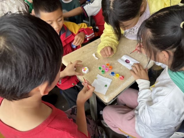 在小龍洞村兒童活動中心,一場妙趣橫生的石膏娃娃手工DIY活動點燃了孩子們的熱情。團隊成員們悉心引導孩子們釋放創意潛能。從講解調色技巧到示范涂繪手法,團隊成員們一步步陪伴孩子們開啟色彩之旅。孩子們興致盎然,分組協作,在小小的石膏胚體上揮灑奇思妙想,有人調出夢幻的粉色,有人勾勒出斑斕的紋路。他們用稚嫩而專注的筆觸,將天馬行空的想象凝固成一件件獨一無二的作品。
