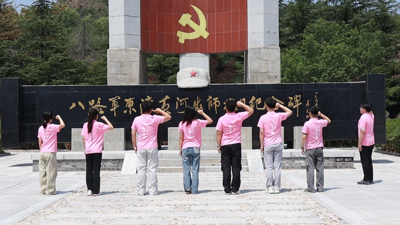 實踐團成員懷著崇敬之心,首先來到八路軍東渡黃河出師抗日紀念碑前。莊嚴肅穆的氛圍中,大家整齊列隊,向革命先烈默哀致敬。紀念碑正面 “八路軍東渡黃河出師抗日紀念碑” 的鎏金大字在陽光下熠熠生輝,無聲訴說著那段波瀾壯闊的歲月。