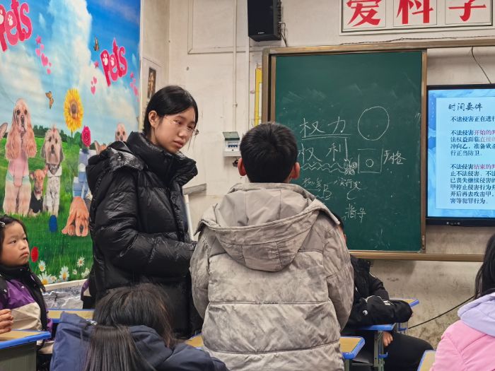 法律科普環節中,支教隊員結合小學生的生活實際,用通俗易懂的語言講解正當防衛的法律知識,結合真實案例拆解正當防衛的構成條件,引導孩子們分清合法與非法的界限,學會在遇到危險時運用法律武器保護自己,增強自我保護意識和法治觀念。隊員們通過互動提問、情景辨析等方式,調動孩子們的參與積極性,讓法治觀念深入人心,助力孩子們健康成長。